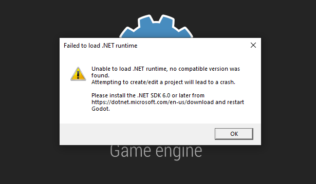 If the Godot editor fails to load the .NET runtime, the following error message will appear at startup: