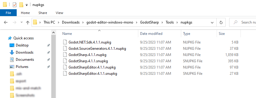 GodotSharpEditor.<version>.snupkgGodot.NET.Sdk.<version>.nupkgGodot.SourceGenerators.<version>.nupkgGodotSharp.<version>.nupkgGodotSharp.<version>.snupkgGodotSharpEditor.<version>.nupkg