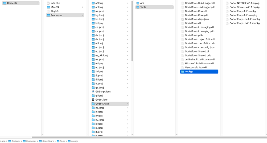 Godot.app/Contents/Resources/GodotSharp/Tools/by right clicking theGodot.appfile in Finder, selectShow Package Contents, then navigate toContents/Resources/GodotSharp/Tools/.