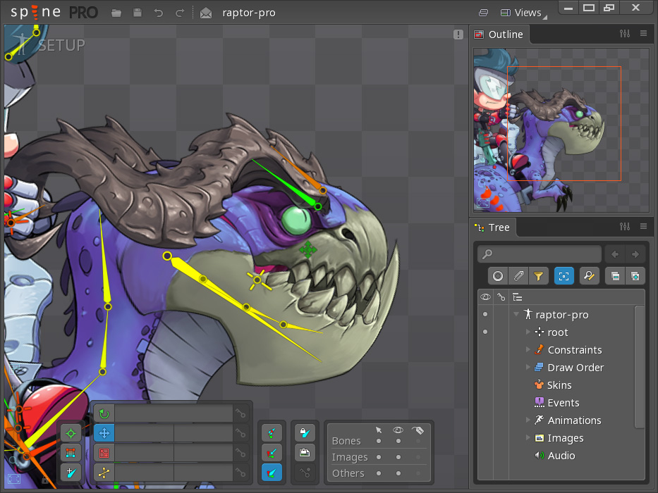 The outline view provides a secondary display of the skeleton pose shown in viewport that is not cluttered with bones, the current selection, or the other UI elements that are shown in the viewport.