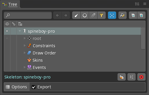 A skeleton represents an animatable character or object. It has bones, slots, attachments, animations, and other parts which are all shown in the tree view.