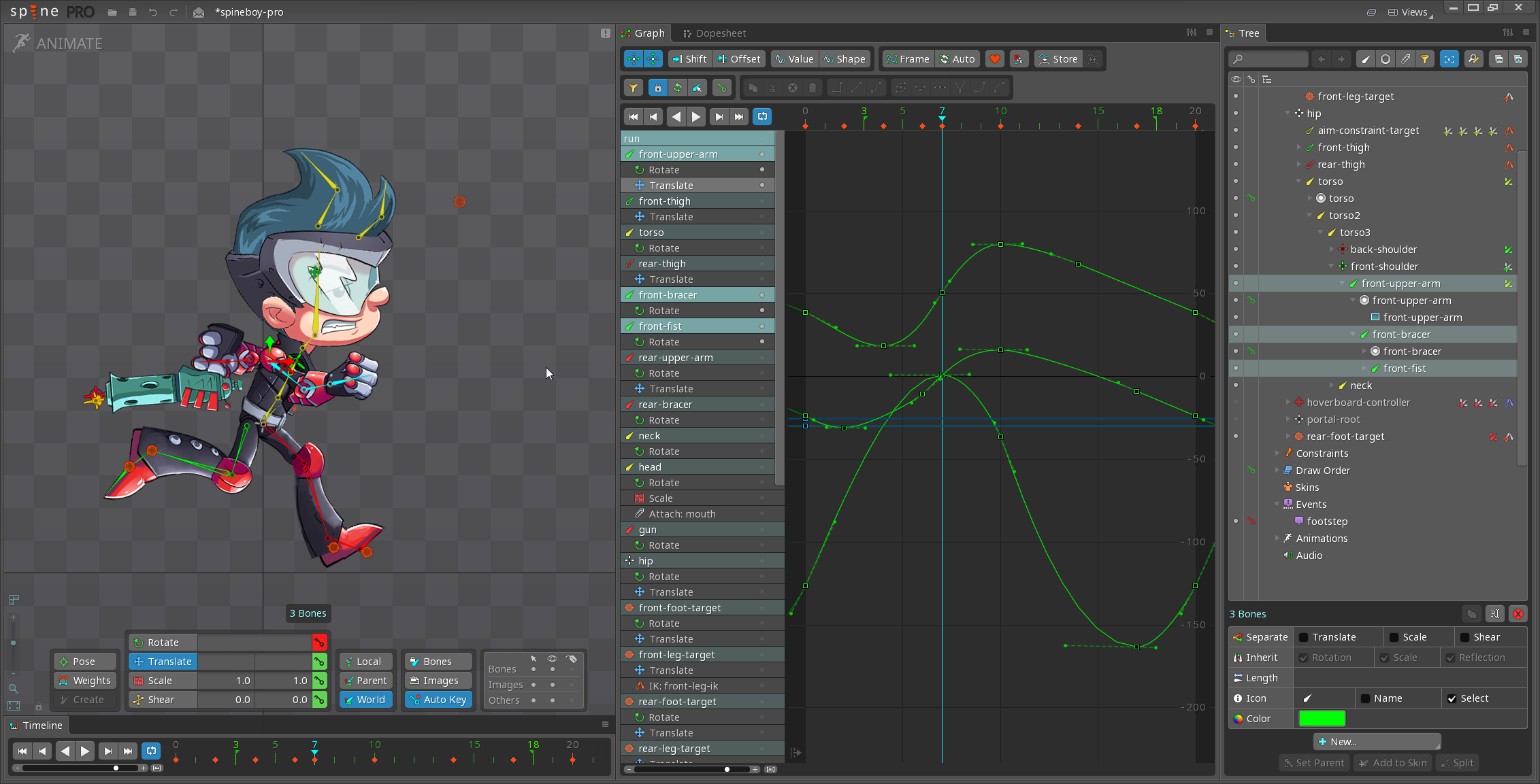 The timeline view allows the timeline to be placed closer to your work area. For example, if the dopesheet or graph is placed to the side of the viewport, the timeline they provide may be near the top of the Spine window. The timeline view can be placed under the viewport to reduce how far the mouse needs to be moved.