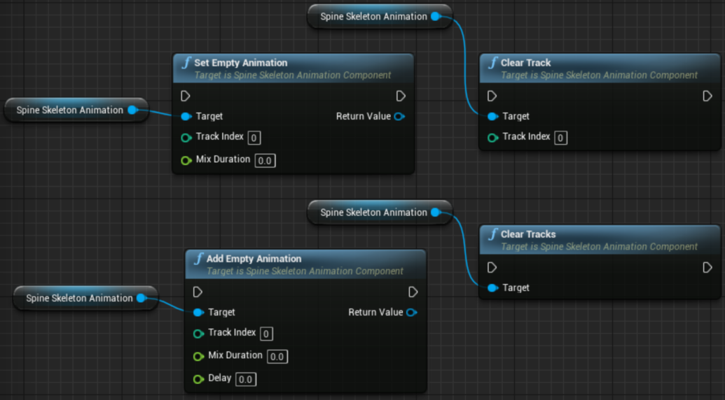 The skeleton animation component also provides methods and blueprint nodes to set an empty animation, queue an empty animation, or clear one or all tracks. All of these work analogous to the methods and nodes shown above.