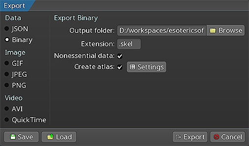 skeleton-name.jsonorskeleton-name.skel, containing your skeleton and animation data.skeleton-name.atlas, containing information about the texture atlas.- One or more