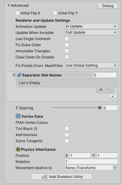 MeshFilter'shide flags toDontSaveInEditor), but at the cost of references to theMeshFilterby other components being lost. When set toUse Global Settings, the setting in Spine Preferences is used. - Separator Slot Names. Slots that determine where the render is split. This is used by components such as