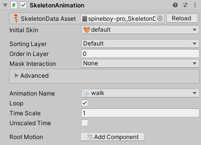 Unfold the Advanced section in the SkeletonAnimation Inspector to show advanced configuration parameters.