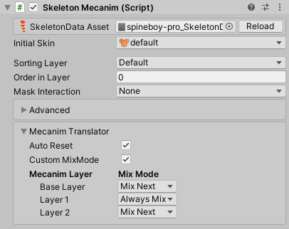 Canvas. Renders and interacts with UI masks such asRectMask2Dlike the built-in Unity UI elements. Animation and event behavior is identical to SkeletonAnimation. - SkeletonMecanim - Uses Unity's Mecanim animation and event system for starting, mixing and transitioning between animations. Provides fewer animation mixing and transition options than SkeletonAnimation. When using