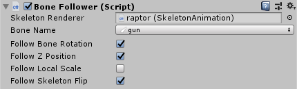 The SkeletonUtilityBone component provides a convenient interface to let GameObjects follow a bone position, override a bone position manually or via 2D and 3D physics. It can be configured to either follow the local bone position or override it on every Update. When set to Override, the component will set the bone position before the SkeletonAnimation component updates the world transforms.