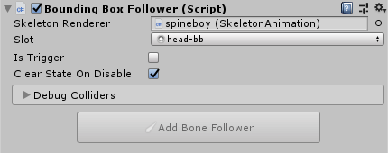 BoneFollowercomponent. You can use theAdd Bone Followerbutton in theBoundingBoxFollowerinspector to create and setup aBoneFollowercomponent.