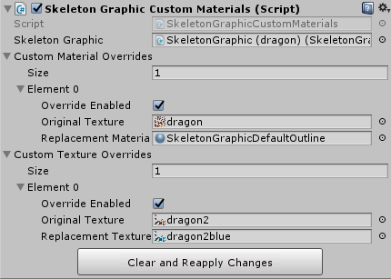 You can right-click on a SkeletonGraphic and select Add Basic Serialized Custom Materials to add this component to the GameObject. Add entries to the Custom Texture Overrides array to replace one texture with another for the whole skeleton. Add entries to the Custom Material Overrides array to replace the used material at an original texture (before replacement) with another material. Be sure to check Override Enabled to enable the respective texture or material overrides.