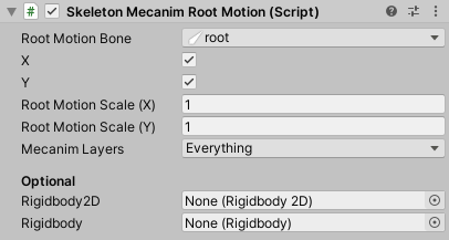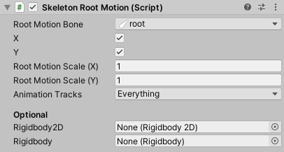 Rigidbodyis assigned, movement is applied via physics to the givenRigidbodyinstead of theTransformcomponent. It is then recommended to set the skeleton animation component'sAdvanced-Animation UpdateInspector parameter toIn FixedUpdate.