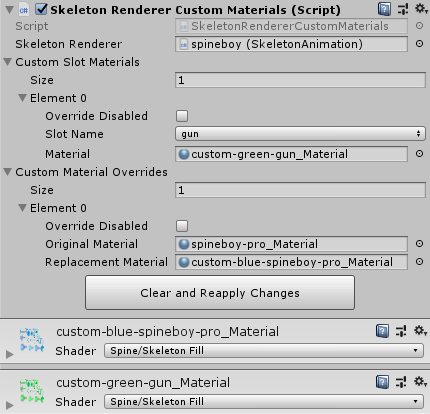You may want to override materials for a specific Skeleton instance or even only at certain slots. This component provides an inspector interface to assign custom material overrides for SkeletonRenderer.