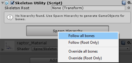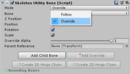 Follow all bonesCreatesSkeletonUtilityBoneGameObjects for all bones in the hierarchy, set to modeFollowFollow (Root Only)Creates only the rootSkeletonUtilityBoneGameObject, set to modeFollowOverride all bonesCreatesSkeletonUtilityBoneGameObjects for all bones in the hierarchy, set to modeOverrideOverride (Root Only)Creates only the rootSkeletonUtilityBoneGameObject, set to modeOverride