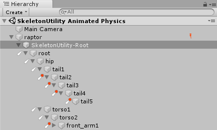 Once your hierarchy of SkeletonUtilityBones is created, the Hierarchy panel shows different icons next to a SkeletonUtilityBone GameObject depending on whether it is set to