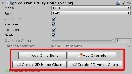 The SkeletonUtilityBone Inspector also provides an interface to create additional child bones (selectively or recursively) or create a 2D and 3D hinge chain.